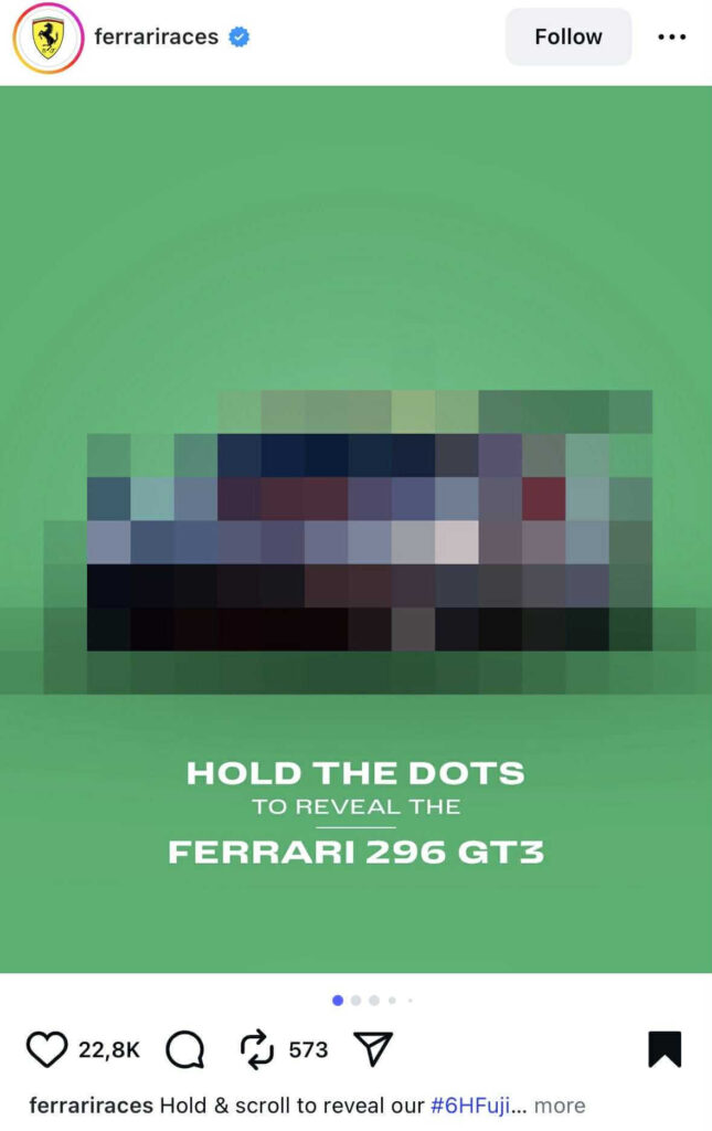 Create a multi-image Instagram post and slowly reveal something in each slide. The first image should include instructions for viewers to scroll to see the full reveal, like Ferrari did in one of their posts.