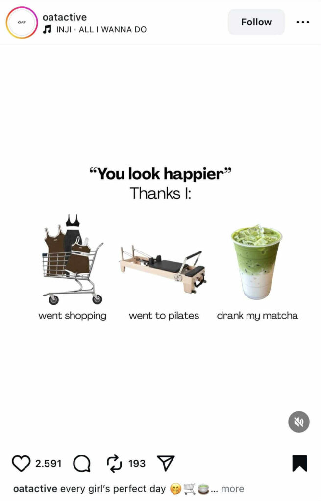 This trend is simple. Pretend someone says, “You look happier,” and respond with a funny or relatable reason, like “Thanks, everyone laughed at my joke on Slack,” “Thanks, I just ordered new clothes,” or “Thanks, I bought tickets to see Beyoncé.”